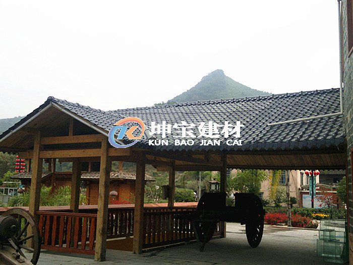生態觀光園建筑大多采用木質結構,屋面鋪上了合成樹脂瓦,提高了房屋抗風抗震的特性。增添了其對屋面建筑裝飾的作用,特別是那仿古屋檐頭的龍尾翹腳,提高了整個屋面的延展性。